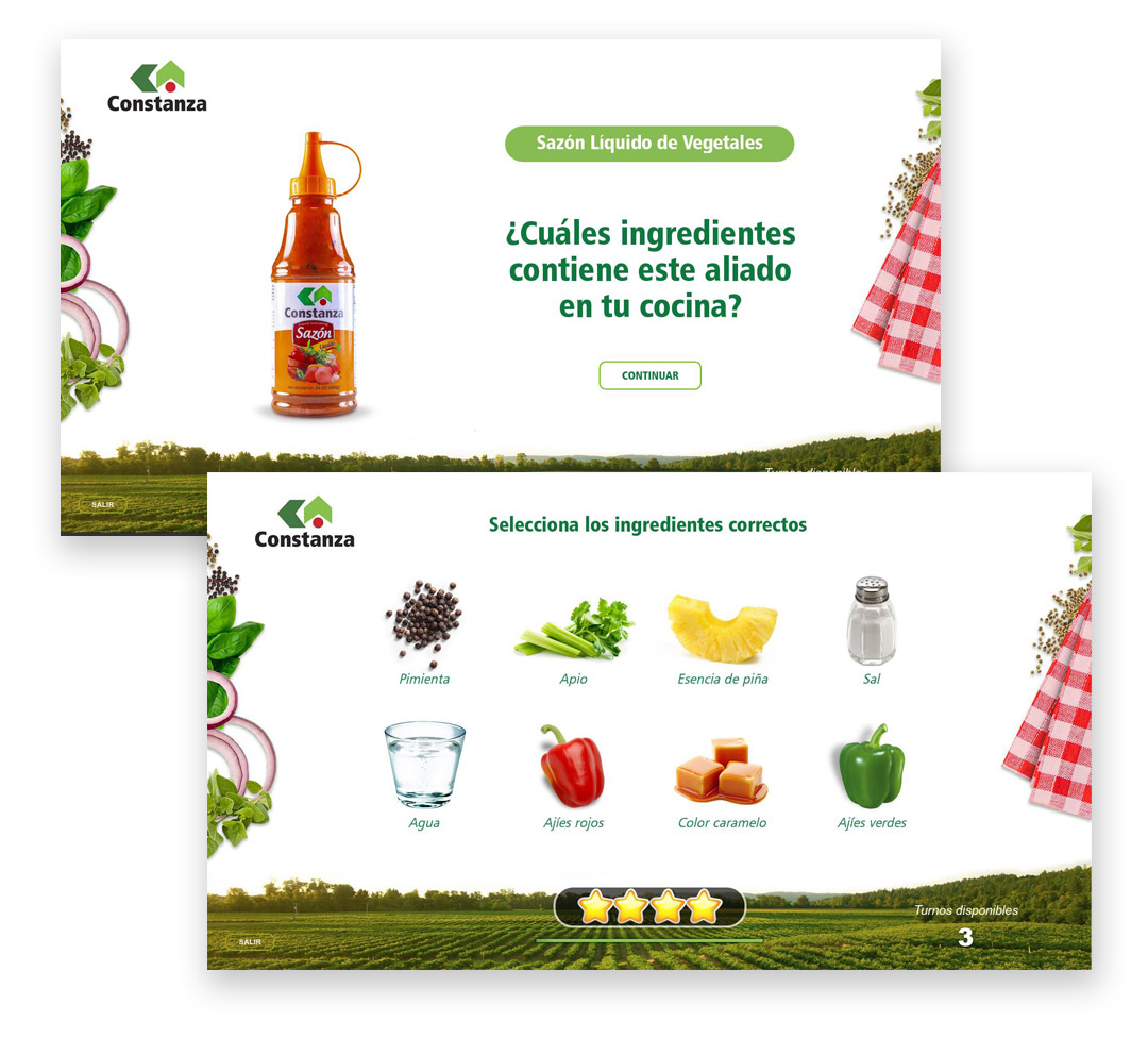 A promotional game designed to interact with Constanza® products where the user visiting the event points out the ingredients that correspond to each one, learning from its contents in a fun way and winning prizes.