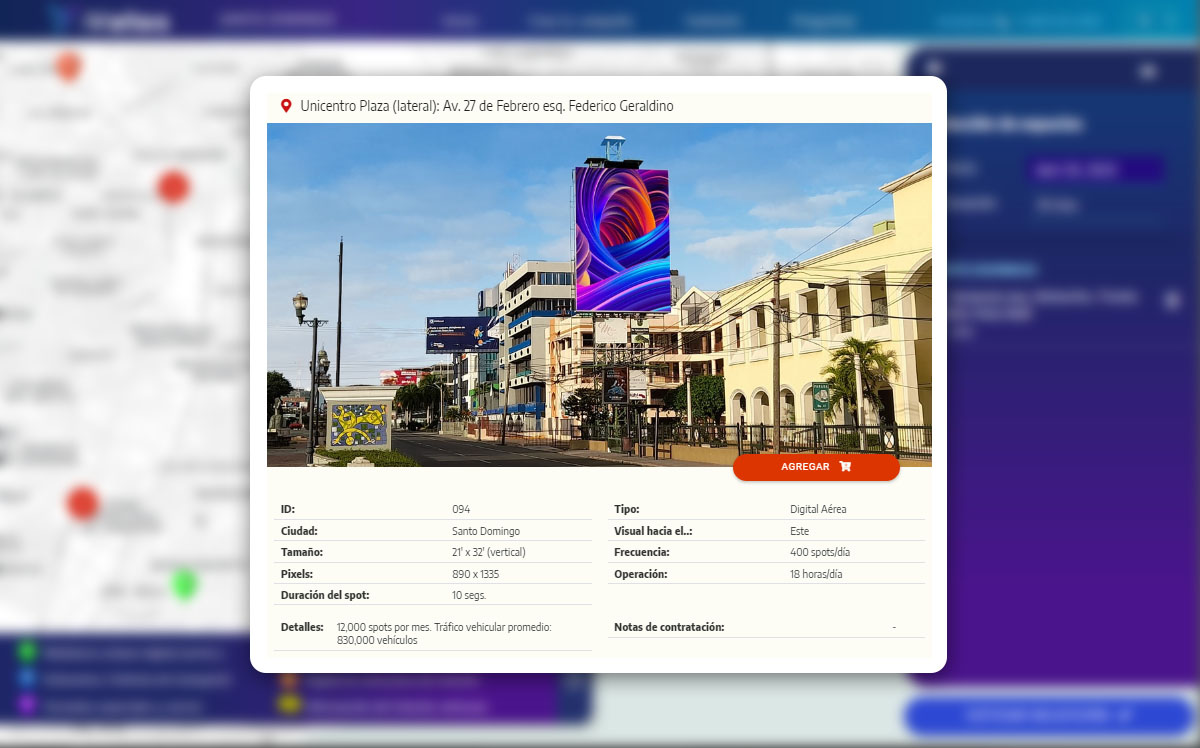 As an added value, the system allows to visualize interactively, data on the volume of traffic in different points of the map which enriches the user’s decision power regarding the purchase of media.