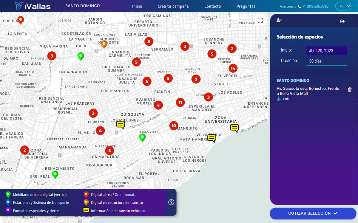 In the interactive map, the user can select the billboards of his preference and define the exposure time of his advertising campaign to request his quotation in the same way.