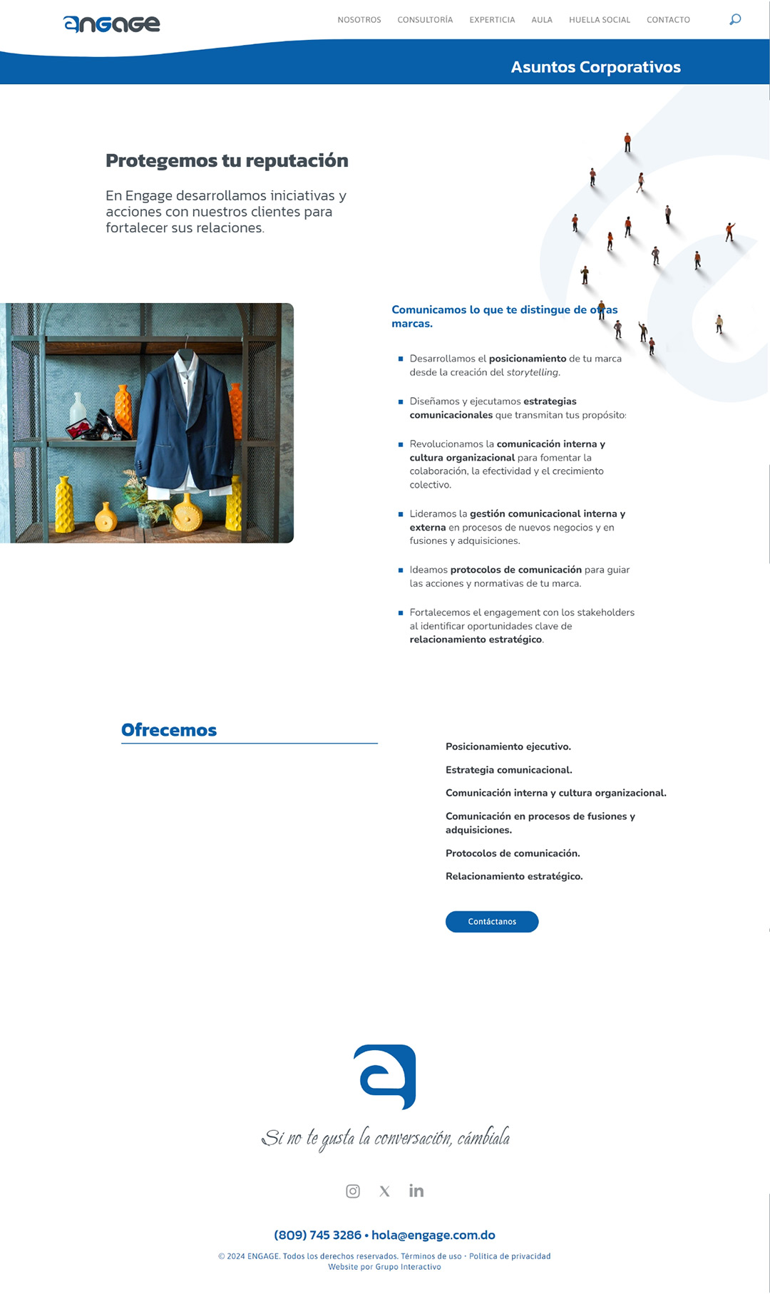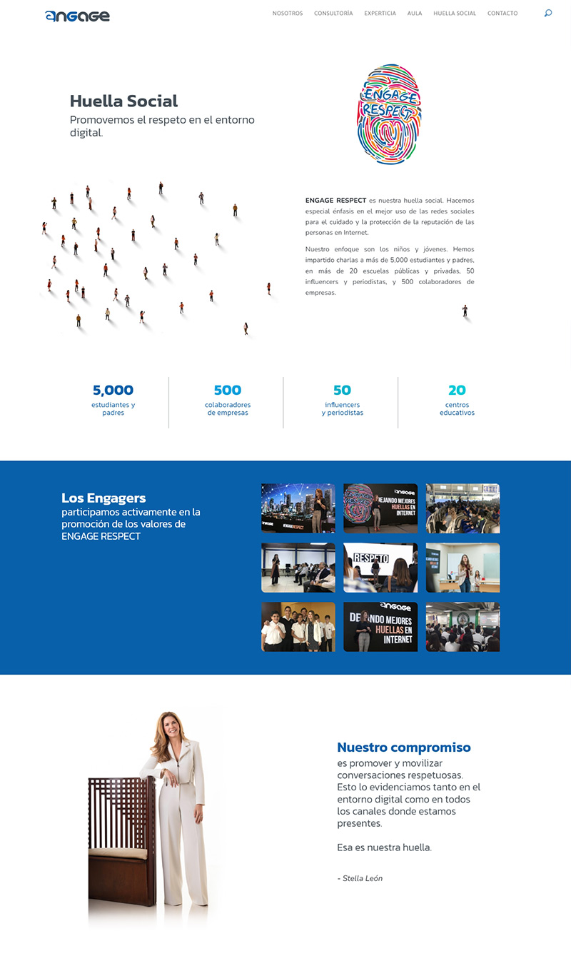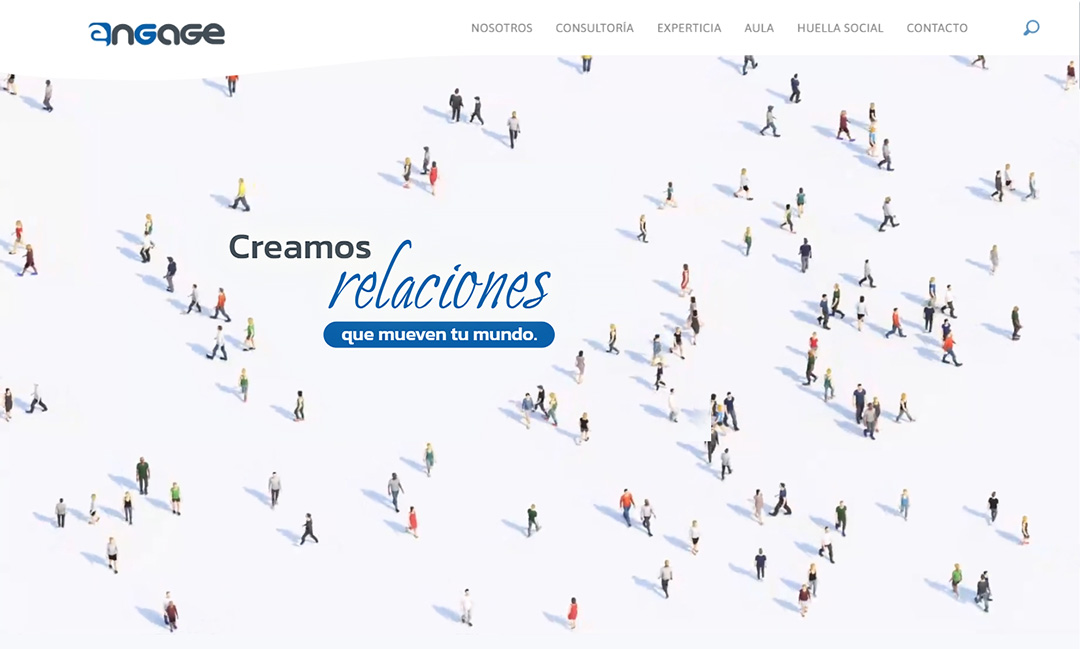 Diseño de página web corporativa para la reconocida agencia de relaciones públicas y comunicación de marca ENGAGE en la cual hemos creado una portada con un innovador concepto animado que representa el impacto de la comunicación en el público de las marcas.