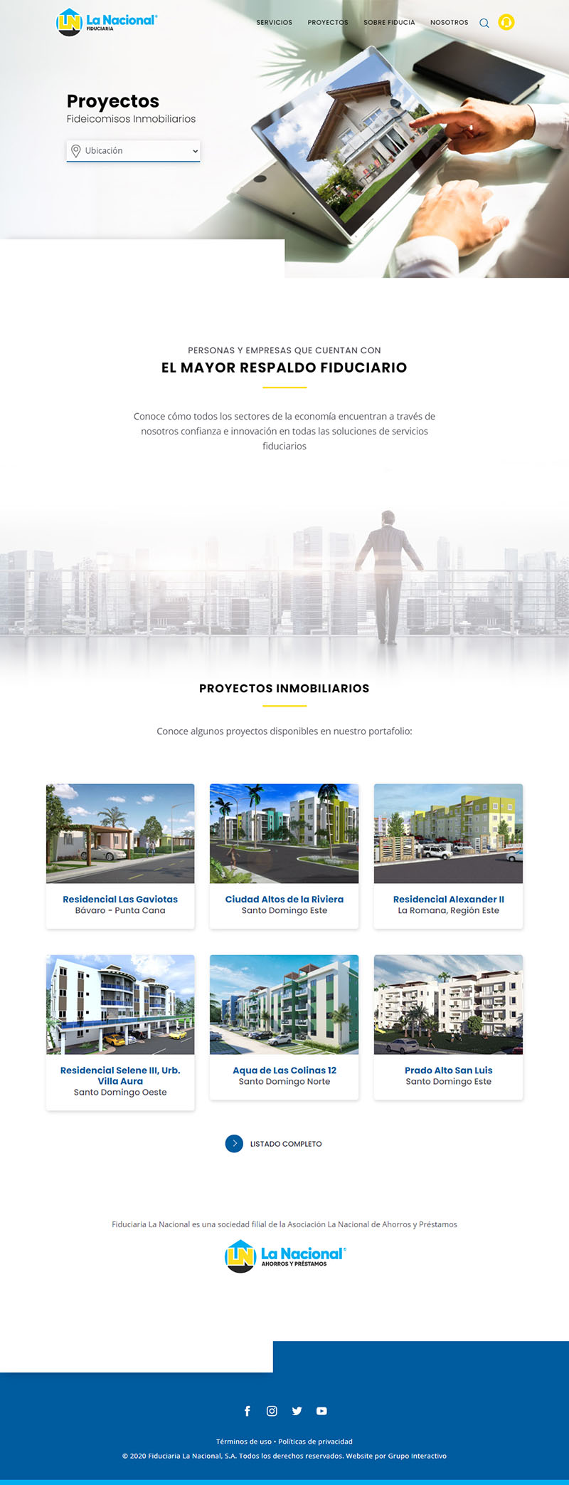 El diseño de este website procura presentar las soluciones de servicios fiduciarios así como la cartera de proyectos inmobiliarios mediante una interfaz simplificada y de línea moderna.
