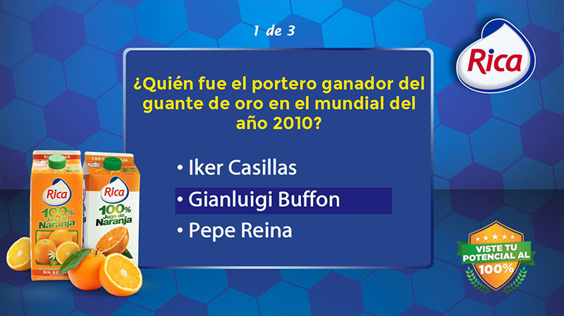 Como medio de participación en la promoción “Viste tu Potencial al 100%” de Jugos Rica, desarrollamos una aplicación interactiva tipo Juego de Preguntas («Soccer Quiz» ) presentada al público en tabletas.