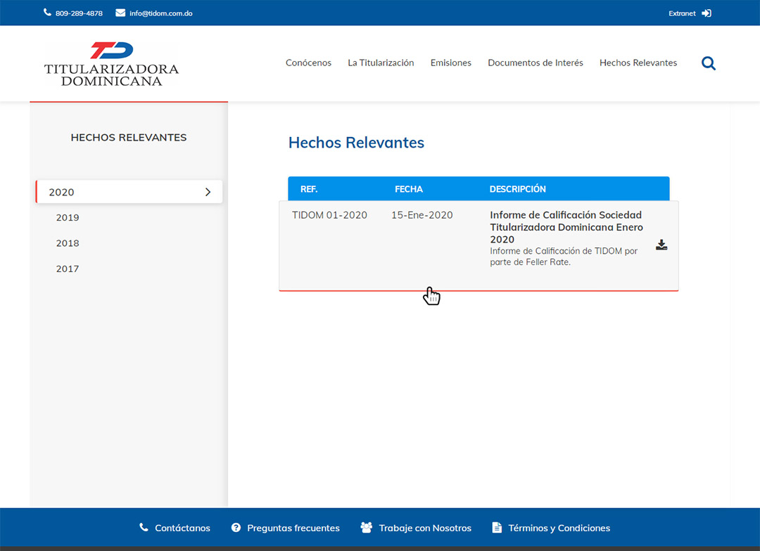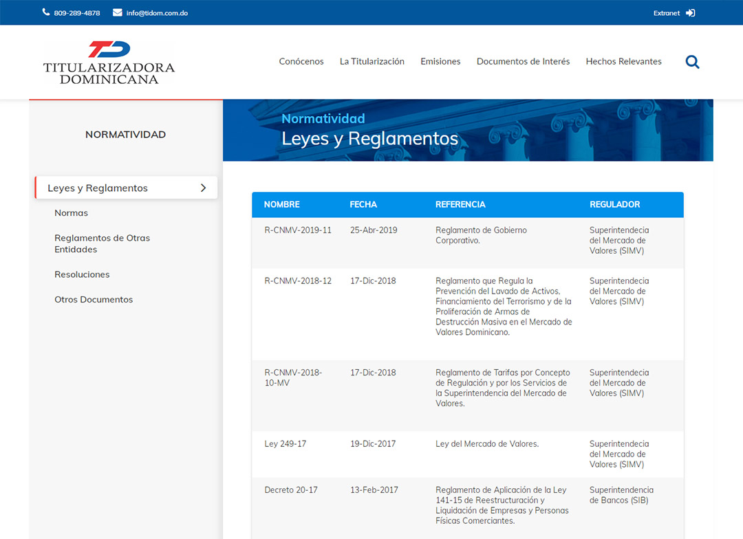 Su website corporativo provee a los inversionistas consultas a la base de emisiones de títulos, con información detallada de cada prospecto, avisos de ofertas públicas, calificaciones de riesgo, contratos, tablas de amortización, hechos relevantes, documentos de interés y noticias relativas al mercado de la titularización.